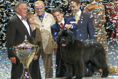 Mies esittää mustavalkoista koiraa.