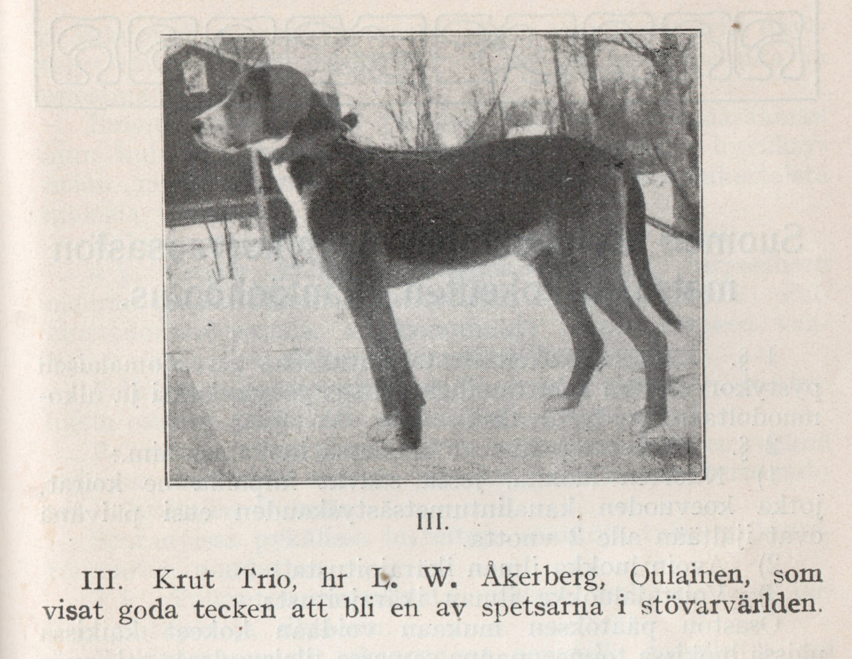 Krut Trio 565 VIII on saanut näyttelyssä vain kiitosmaininnan, mutta rakenteeltaan se on voimakas ja jalo, eikä koetuloskaan ole sen parempi kuin III-palkinto yksin ajettuna vuonna 1913. Jalostuskoirana tämän yksilön arvo perustuu kuitenkin siihen, että se on erittäin metsästysviettisen perheen jäsen. Krut Trion sisar Luppa 339 IX ja vielä paremmin Jänta 338 IX ovat osoittautuneet varmoiksi koevoittajiksi, puhumattakaan isästä ja isoisästä, jotka olivat varsinaisia ässiä.