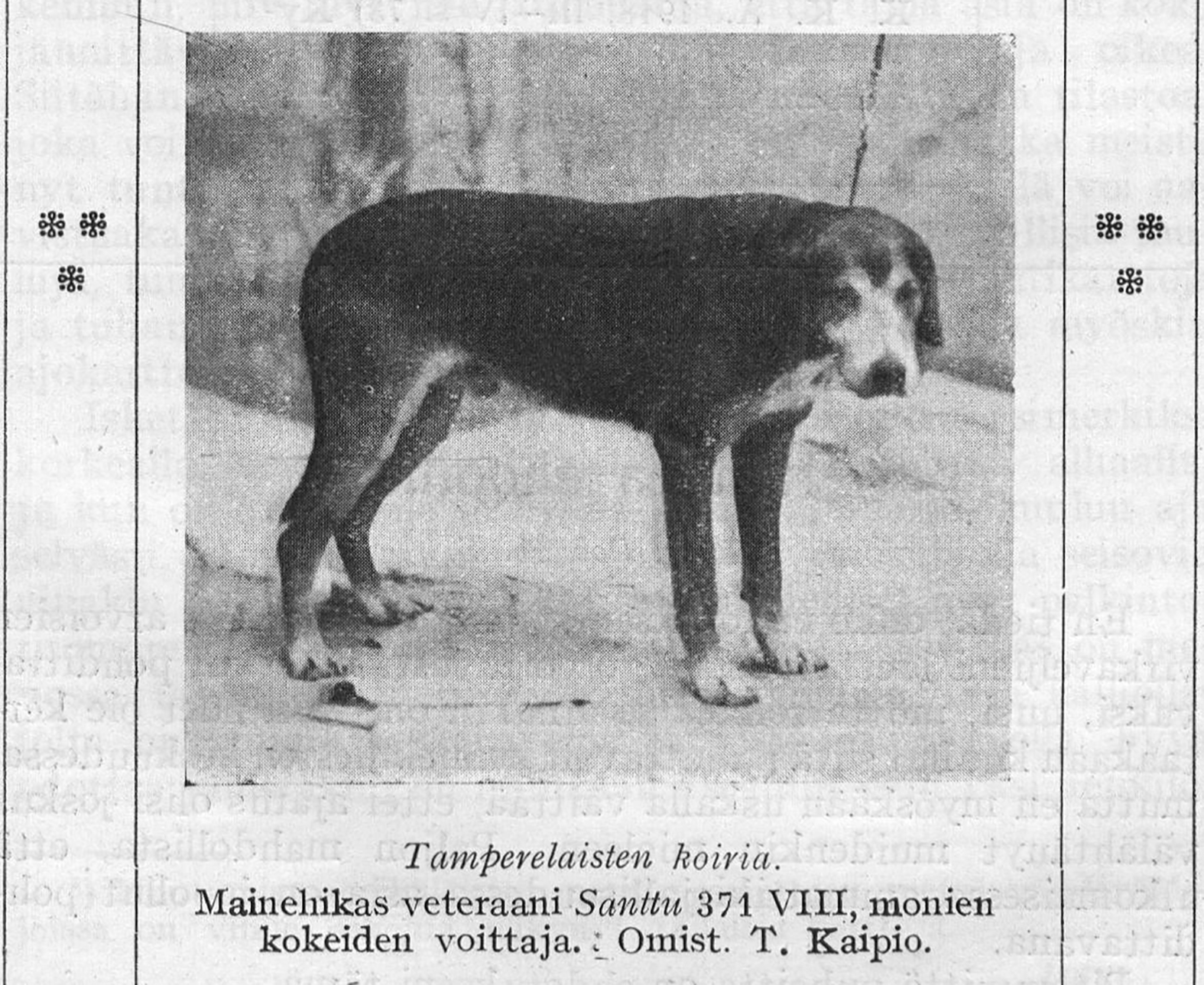Nimimerkki Larus käsittelee Finska Kennelklubbens Tidskriftissä nro 2/1917 suomalaisten ajokoirien jalostusta ja tunnustaa siinä ilmenneet vaikeudet. Palveluksena nartunomistajille hän esittelee kuusi kuumaa nimeä ajokoirien siitosmarkkinoilta.