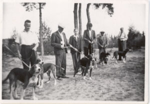 1936 maaottelun Suomen joukkue vasemmalta: Hra V. Salonen ja Turma av Furuborg, joht. S. Blomqvist ja Tora av Furuborg, kamreeri Arthur Ek ja Bonn, ryhmän johtaja Uno Bask, tri L. Malmgren ja Peuha Halu sekä hra F. Dahlstedt ja Ukko av Huuna Träff.