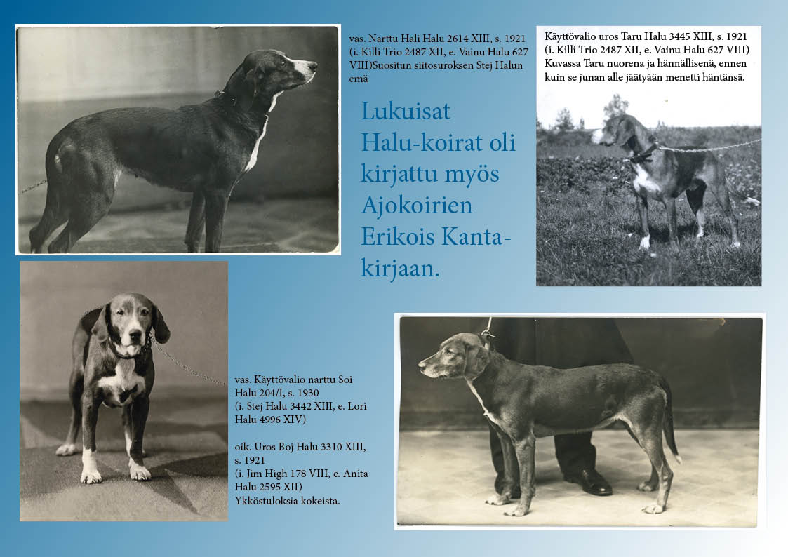 Maamme rajat ylittävää mainetta Halu-koirille toi kuitenkin 1930 syntynyt narttu Peuha Halu 9751 XVIII, joka voitti vuosina 1936 ja 1937 järjestetyn Suomi-Ruotsi maaottelun. Muutamia 1920- ja 1930-luvulla vaikuttaneita Halu-koiria löydät täältä.