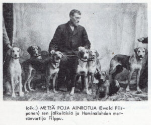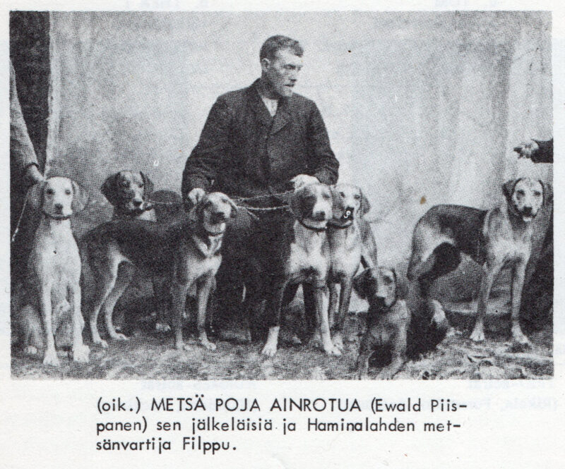 Kerran satuimme Piispanen ja minä eräälle metsätielle ja tullessamme sinne huomasimme me, että jänis oli tulla tupsahtanut tielle meitä vastaan, vaan ehti se kääntää metsään meidän sitä näkemättä. Ja nyt seurasi mitä kauneinta ajoa. Kului tunti, kului kaksi, kului kolmaskin ilman mitään taptia (hukkaa). Silloin kuului pyssyn pauke. Ampuja oli varmaankin jahtimestari Filppu, koska emme olleet häntä pitkään aikaan nähneet. Odotimme neljännes tuntia, jo tuli Filppu Pojan ajama jänis ammuttuna. Tämä oli kauneinta ajoa, minkä allekirjoittanut, joka on paljon Metsä Pojan kanssa metsästänyt, oli kuullut. Metsä Poja voitti loistavasti Savon Sarven, joka 3:sti voitettuna joutui ikiomaisuudeksi Maisteri Evald Piispaselle.