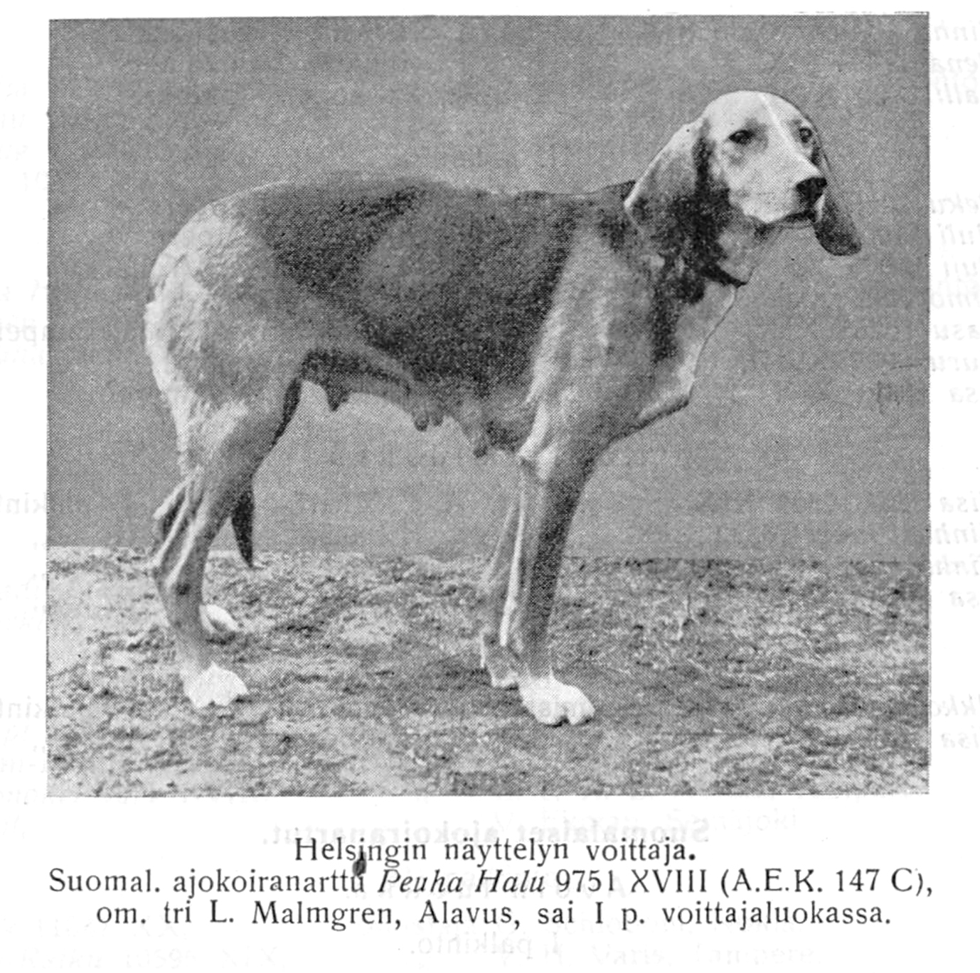 ”Kuljettuamme noin kilometrin matkan huomasimme tuoreita jäniksen jälkiä lumessa. Poja oli juuri laskettu irti ja huomasi ne myöskin. Ei kestänyt kauan, ennenkuin haukku alkoi eikä kauan viipynyt ennekuin näimme jäniksen huimaa vauhtia Poja kintereillä täyttä nelisten laukkaavan mäen rinnettä alas ja poikki joen syvään hongikkoon, jolloin riensimme perästä ja kuljettuamme parisen kilometriä eteenpäin kuulimme haukusta, että jänis oli alkannut tehdä säännöllisiä kierroksia, kiertäen soita ja mäkiä.