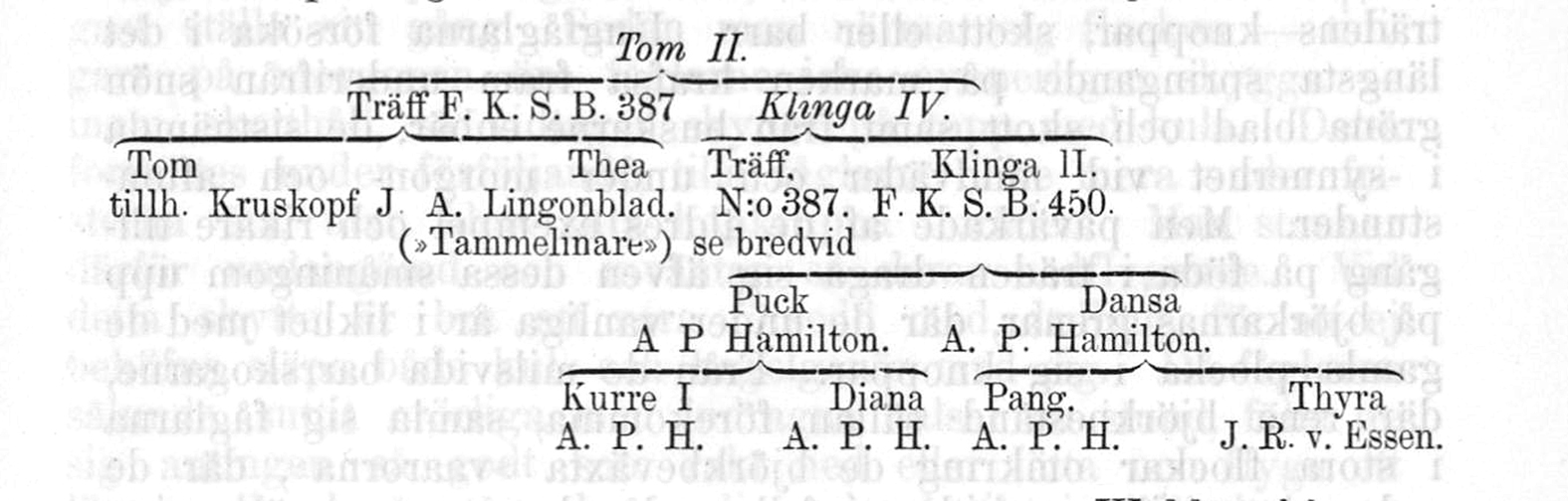 Träff 387 II:n tytär Klinga IV ja poika Tom II olivat sekä puolisisaruksia että emä ja poika, mutta myös 1910-luvun parhaita koiria.