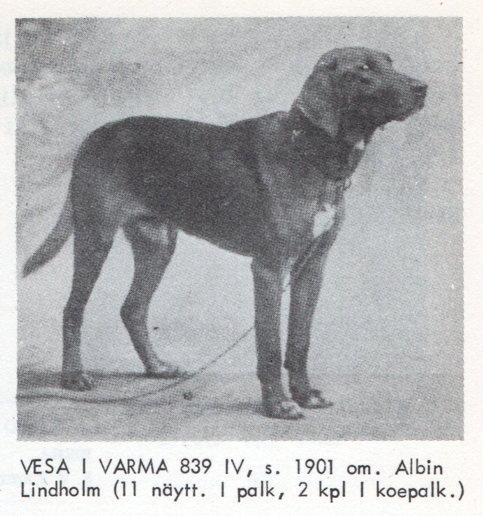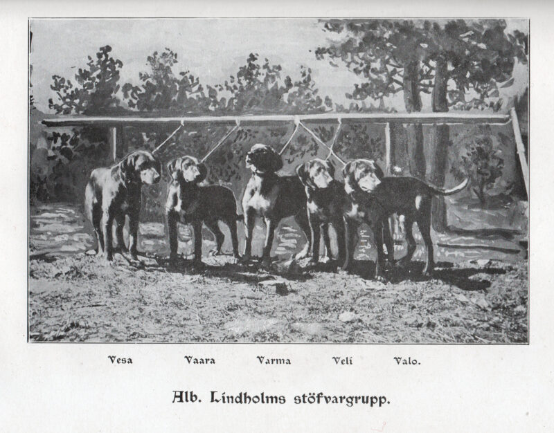 Albin Lindholmin kasvatit olivat paitsi kauniita, myös taitavia ajureita. Kuvassa Varma-Valo ja sen neljä pentua; urokset Vesa, Veli ja Valo sekä niiden sisar Vaara. Lohjalla 1902 pidetyissä ajokokeissa ajoivat koppelina Vaara ja Veli, sekä Valo ja Vesa kumpikin pari nuorten luokassa ykköspalkinnon. (koppeli =koirapari, joskus kolmen ajue)